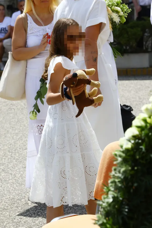 A kislány végül elment, a róla készült fotókon pedig jól látszik, hogy egy aranyos plüsskutyust szorongat a ravatal előtt állva.