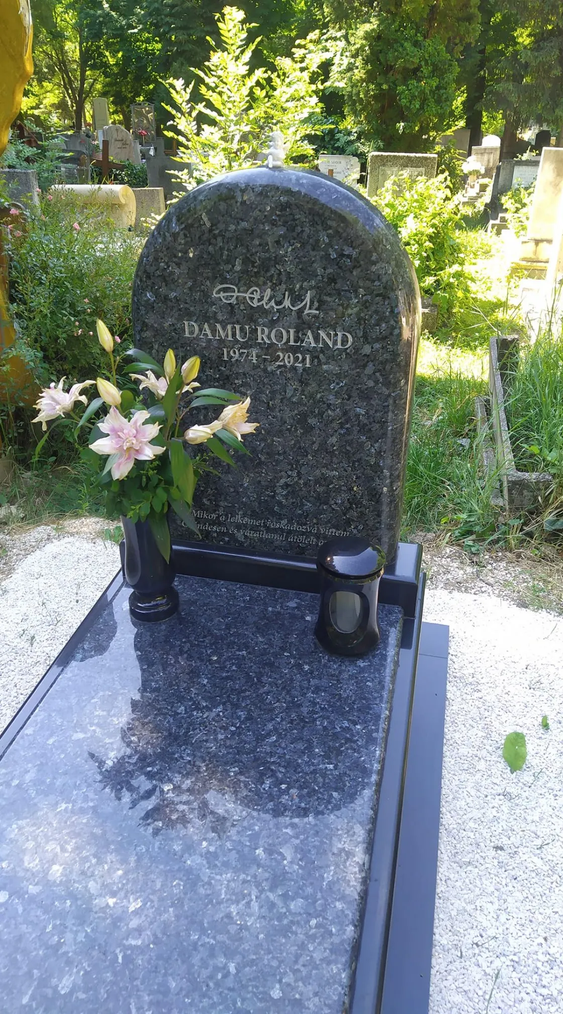 "Még a múlt héten jártam a Farkasréti temetőben, egy távolabbi rokonom nyugszik ott. Miután meglocsoltam a sírján a virágokat, gondoltam, megnézem Damu Roland sírját. Tudom, hogy nagyon megosztó személyiség volt, én mégis tiszteltem a művészetét, még az önálló estjén is jártam. Lesújtott a halála. Azt viszont örömmel láttam, hogy nagyon szép a sírja, és egy kis angyal őrködik felette"