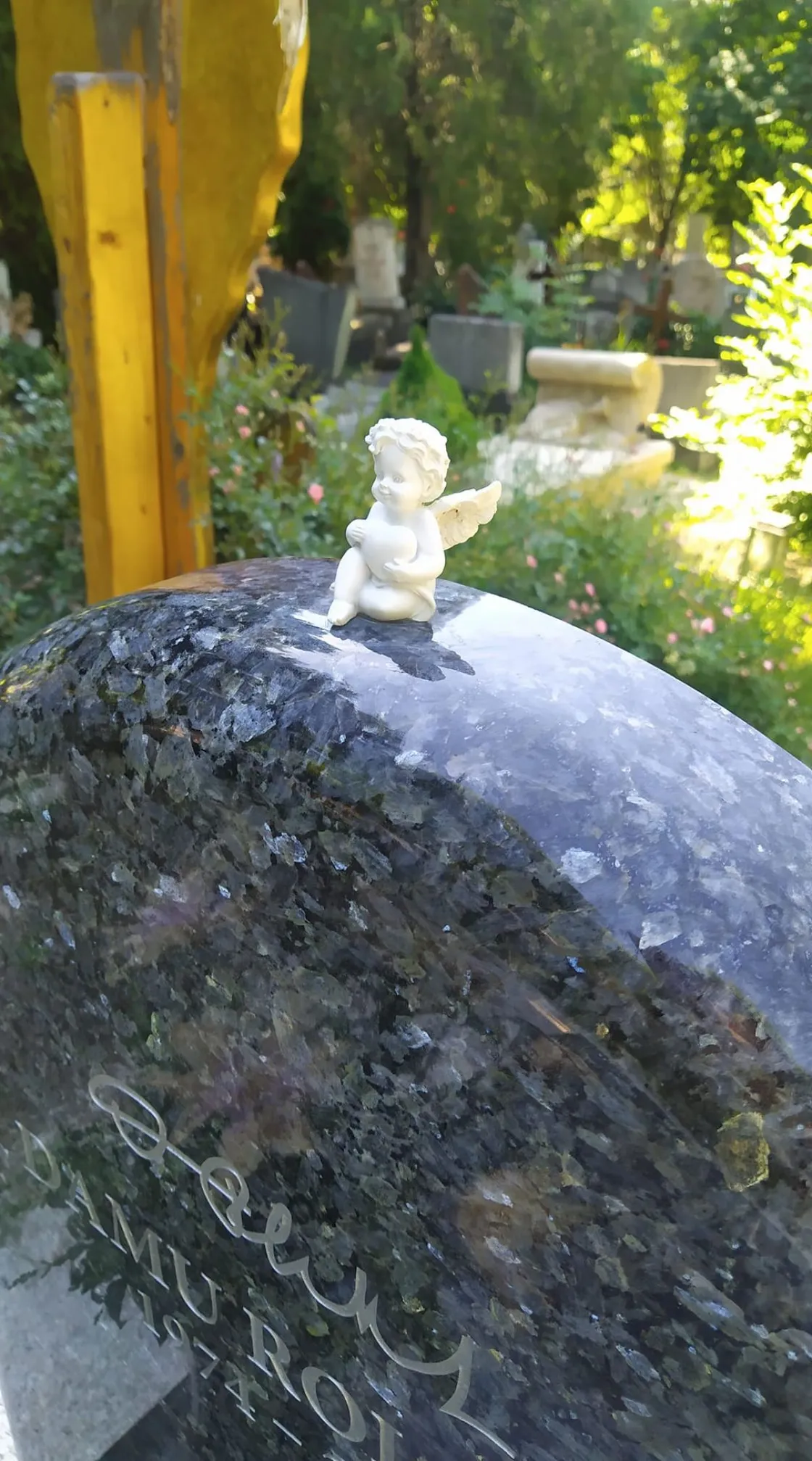 Bár Damu Roland élete tele volt magánéleti és szakmai drámákkal, halála óta egy aprócska angyal őrzi örök álmát a Farkasréti temető művészparcellájában.