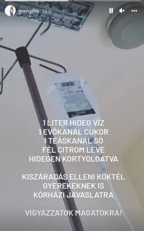 Ijesztő bejegyzést tett közzé Görög Zita! A 24 óráig elérhető instagramos sztorijában egy infúziót mutatott, és némi jó tanácsot is megosztott kiszáradás ellen, amit gyerekeknél is lehet alkalmazni. Mint írta, a kórházban javasolták neki. Nem sokkal később derült ki, hogy idősebb fia, Milán került kórházba, aki valószínűleg a nagy melegtől lett rosszul.