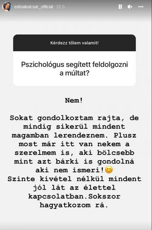 Edinának is feltették a kérdést egy Instagramon folytatott kérdezz-felelekben, hogy vajon ő járt-e terápiára. Az őszinte válasz úgy hangzott, hogy nem kopogtatott be egy pszichológus ajtaján sem, inkább kedvese, a rapper G.w.M bölcsességében bízott és bízik azóta is.