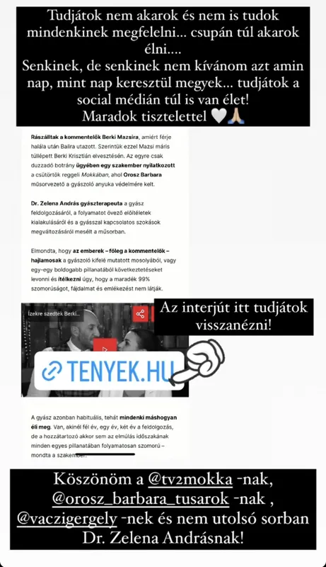 Berki Mazsi keserves időszakon megy keresztül, hiszen amellett, hogy elvesztette férjét májusban, sokan gyűlölködő üzeneteket is küldenek neki. Berki Krisztián özvegye most a közösségi oldalán szólalt fel pár mondatban.