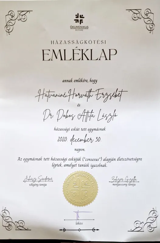 „Nagyon meglepett, amikor a postás a kezembe nyomta a borítékot, amit az Ökumenikus Egyház adott fel. Miután kibontottam, a szavam is elakadt, még szinte most sem térek magamhoz! A boldogságomat nem is tudom szóban kifejezni, hihetetlenül örülök ennek. Pont úgy volt, ahogy az én Drágám akarta, Isten előtt házastársak vagyunk, nekem ez a legfontosabb. Attila is biztos velem együtt örül fent az égben. Még most is alig hiszem el, hogy az álmunk valóra válhatott” – mesélte meghatottan Erzsó, akinek így most már teljes a boldogsága, hiszen utolsó kívánságát is teljesítette Dobos Attilának, a házasságkötési emléklap pedig a többi ereklye mellé kerülhet a komáromi asszony otthonában.