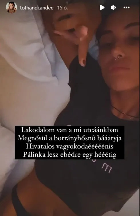 Sőt most egy újabb örömhírt közölt Instagram-oldalán, egy 24 órán keresztül megtekinthető történetben. Tóth Andi testvére ugyanis megnősül, aminek örömére egy hétig terveznek mulatni. A bejegyzésben humora mellett költői vénáját és szépségét is megcsillogtatta. Egy vicces kis versikével adta tudtára rajongóinak az örömhírt, ami így szól: