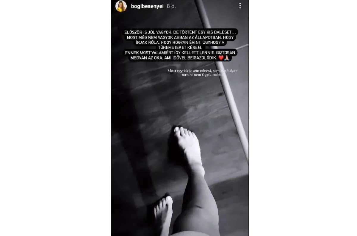 „Először is jól vagyok. De történt egy kis baleset…” - írta fekete fehér fotója mellé, ahol szemmel látható: Bogi jobb bokája teniszlabda nagyságúra dagadt. Emiatt valószínűleg most alig bír lábra állni.