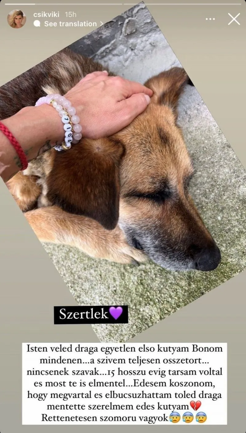 „Isten veled drága, egyetlen, első kutyám, Bonóm, mindenem... A szívem teljesen összetört, nincsenek szavak... 15 hosszú évig társam voltál és most te is elmentél... Édesem, köszönöm, hogy megvártál és elbúcsúzhattam tőled, drága mentett szerelmem, édes kutyám! Rettenetesen szomorú vagyok!” – írta Instagram-sztorijában.