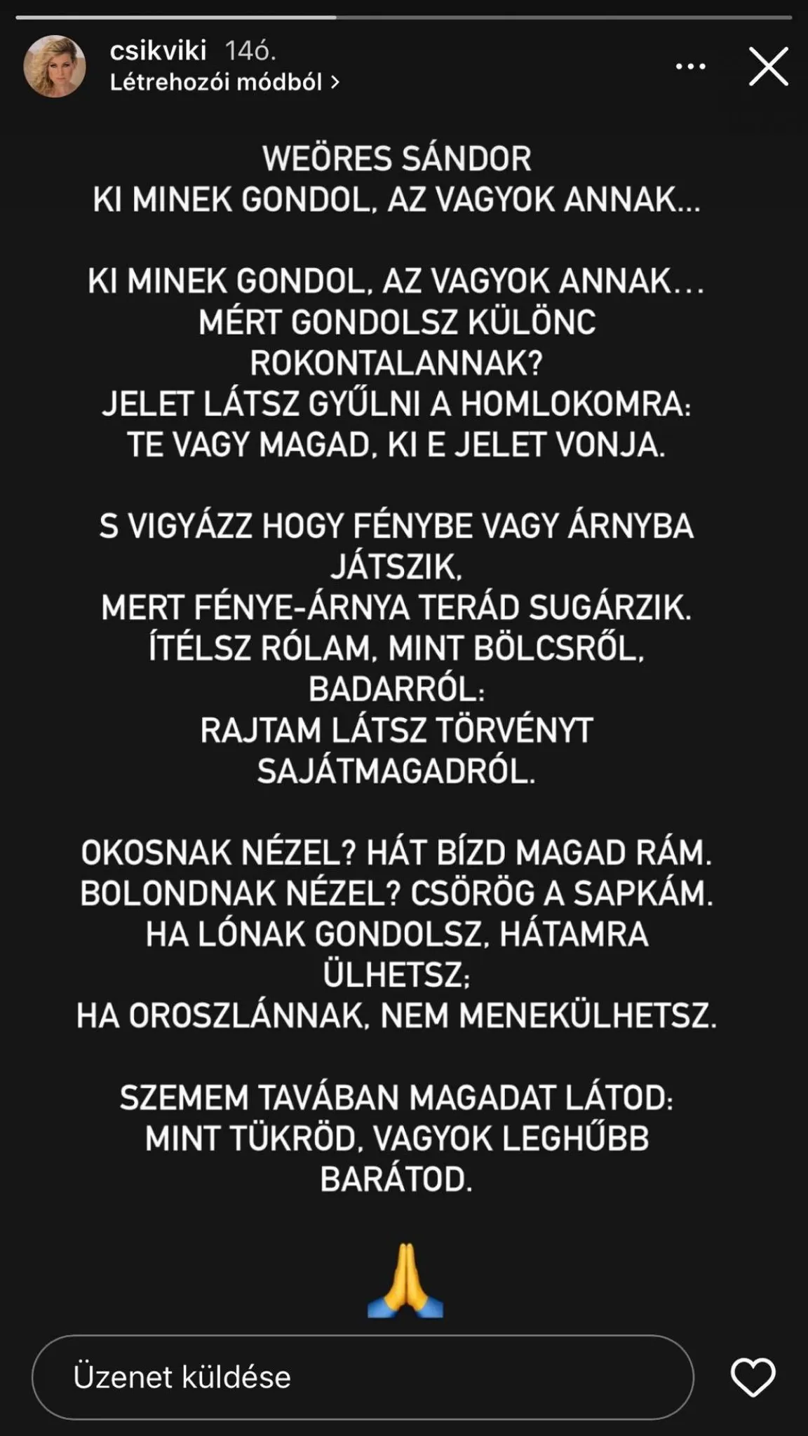 Viki most Insta-sztorijában osztott meg egy Weöres Sándor verset, ami akár egy üzenet is lehet támadóinak.