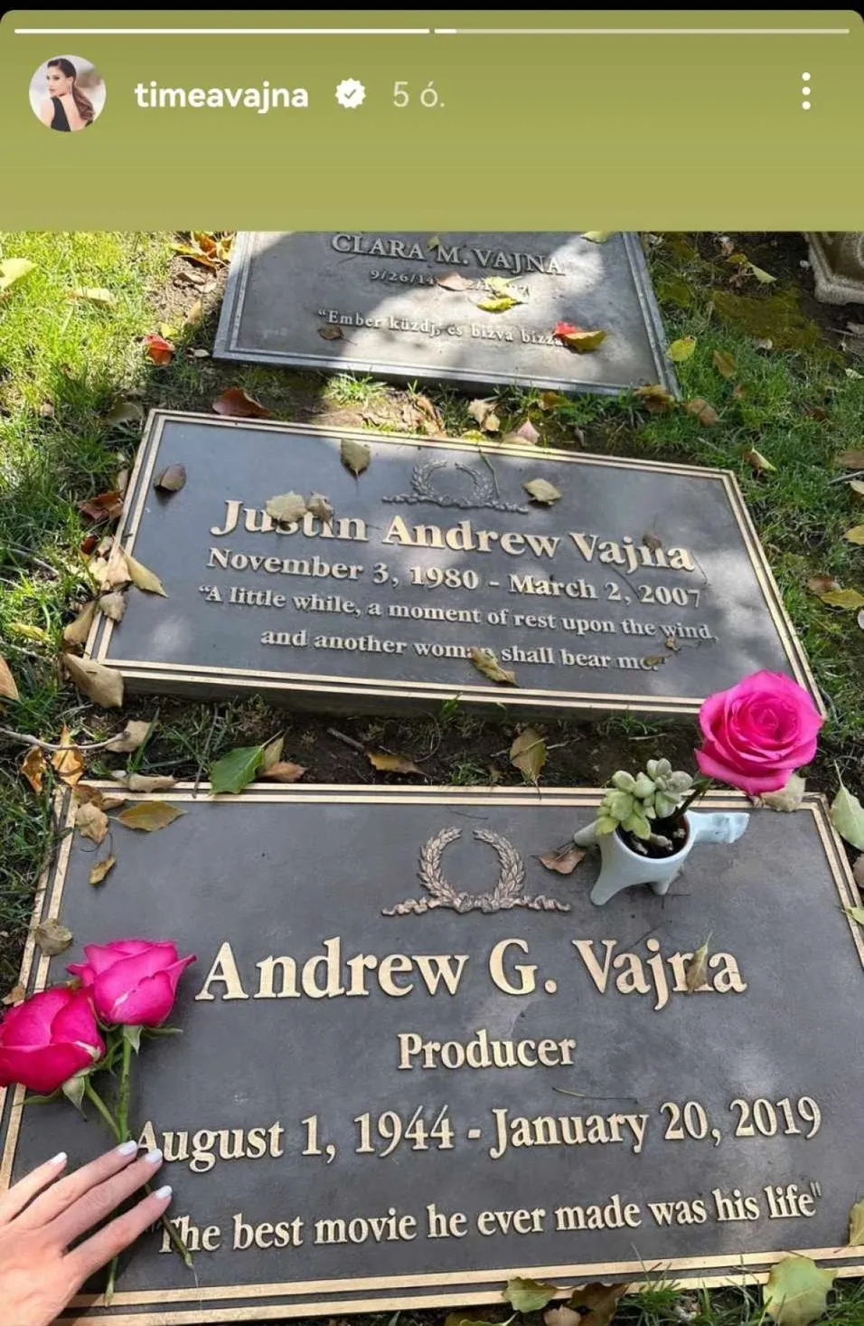 Timi az elmúlt hónapokban beszámolt az embrió elvesztéséről, a hormonkezelésekről, így nyomon követhettük mikor, hogyan érzi magát. Egy másik posztban arról is írt, hogy spermabankban is keresi a megoldást. Éjszaka azonban más témájú képpel jelentkezett, a 24 óráig elérhető story-jában. Andy Vajna sírkövét fotózta le. A vélhetően friss képen három szál rózsa látszik, amit Timi vihetett, megboldogult férjére emlékezve, akit négy éve veszített el. Köztudott, hogy 2013-ban kötötték össze az életüket Los Angelesben, a modell ekkor 30, a filmmogul 69 éves volt. A médiaszereplő az utóbbi időben többször hangsúlyozta az internetes bejegyzéseiben, hogy bánja, hogy nem korábban vágott bele a babaprojektbe – talán arra célzott, hogy ezt megléphette volna, amíg házasságban élt Andyvel.