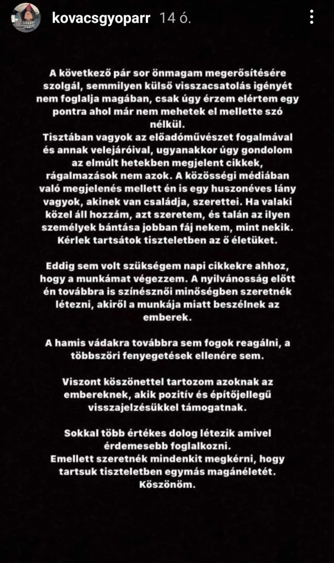"A következő pár sor önmagam megerősítésére szolgál, semmilyen külső visszacsatolás igényét nem foglalja magában, csak úgy érzem, elértem egy pontra, ahol már nem mehetek el mellette szó nélkül. Tisztában vagyok az előadóművészet fogalmával és annak velejáróival, ugyanakkor úgy gondolom, az elmúlt hetekben megjelent cikkek, rágalmazások nem azok. A közösségi médiában való megjelenés mellett én is egy huszonéves lány vagyok, akinek van családja, szerettei. Ha valaki közel áll hozzám, azt szeretem, és talán az ilyen személyek bántása jobban fáj nekem, mint nekik. Kérlek, tartsátok tiszteletben az ő életüket. Eddig sem volt szükségem napi cikkekre ahhoz, hogy a munkámat végezzem. A nyilvánosság előtt én továbbra is színésznői minőségben szeretnék létezni, akiről a munkája miatt beszélnek az emberek" – fogalmazott határozottan Gyopár, hozzátéve, hogy semmilyen hamis vádra nem kíván reagálni, akkor sem, ha fenyegetik.
