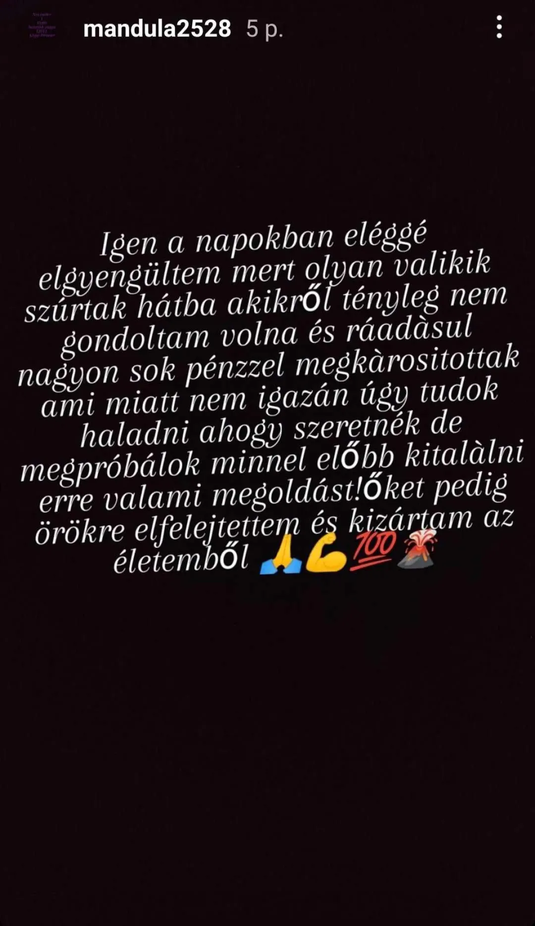 "Igen, a napokban eléggé elgyengültem, mert olyan valakik szúrtak hátba, akikről tényleg nem gondoltam volna, és ráadásul nagyon sok pénzzel megkárosítottak, ami miatt nem igazán úgy tudok haladni, ahogy szeretnék, de megpróbálok minél előbb kitalálni erre valami megoldást. Őket pedig örökre elfelejtettem és kizártam az életemből"