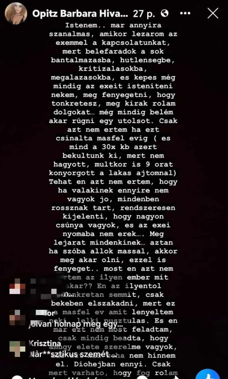 Ha ezt nem fejezed be most azonnal, mármint Barbi zsarolását, fenyegetését. Sőt, életveszélyes fenyegetéseit, és a privát tartalmaitok megosztásával való fenyegetéseket, akkor én foglak feljelenteni most már tényleg, ahogy legutóbb privátban leírtam neked