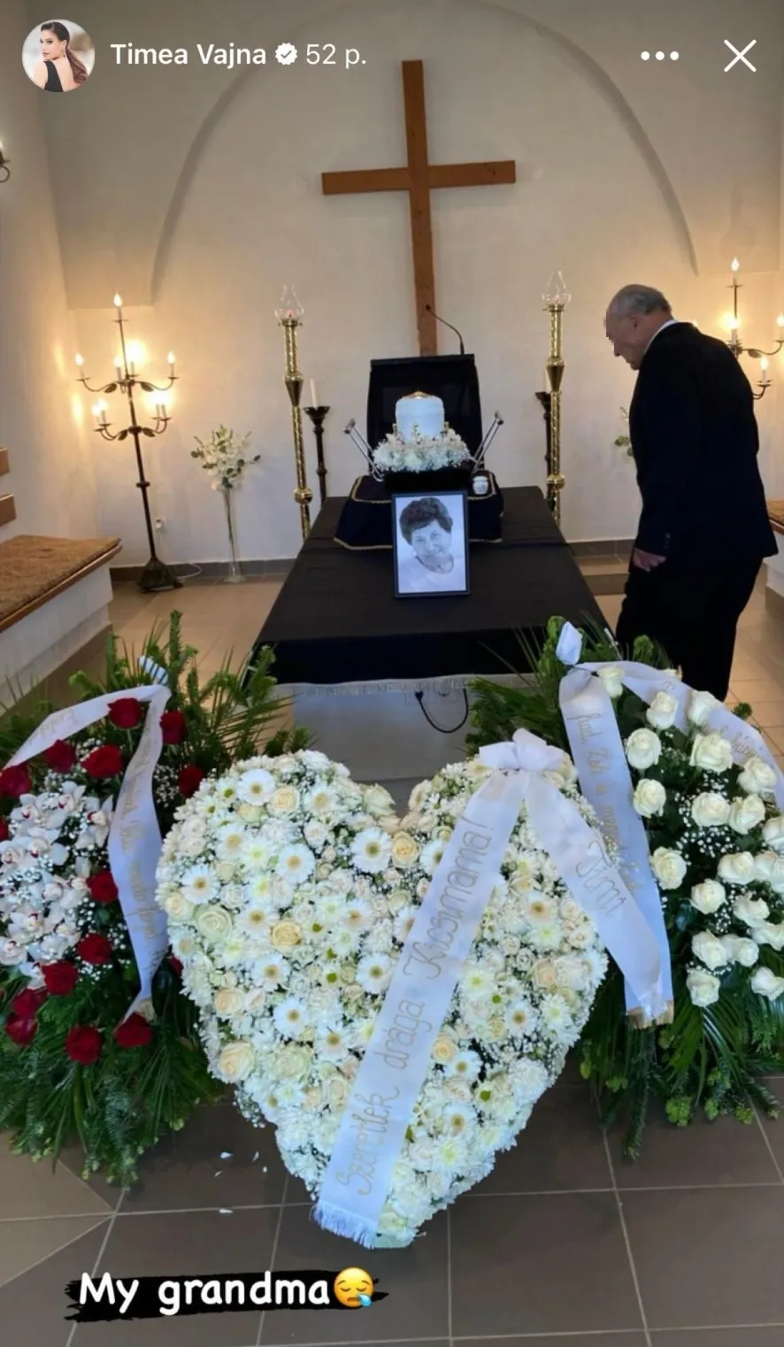 Timi pénteken este a nagymama búcsúztatójáról osztott meg egy fotót Instagram-történetében. A ravatalon az elhunyt fotója is látható.