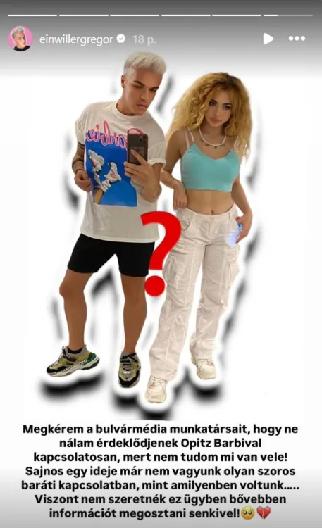 „Megkérem a bulvármédia munkatársait, hogy ne nálam érdeklődjenek Opitz Barbival kapcsolatosan, mert nem tudom, mi van vele! Sajnos egy ideje már nem vagyunk olyan szoros baráti kapcsolatban, mint amilyenben voltunk… Viszont nem szeretnék ez ügyben bővebb információt megosztani senkivel!” – zárta rövidre.