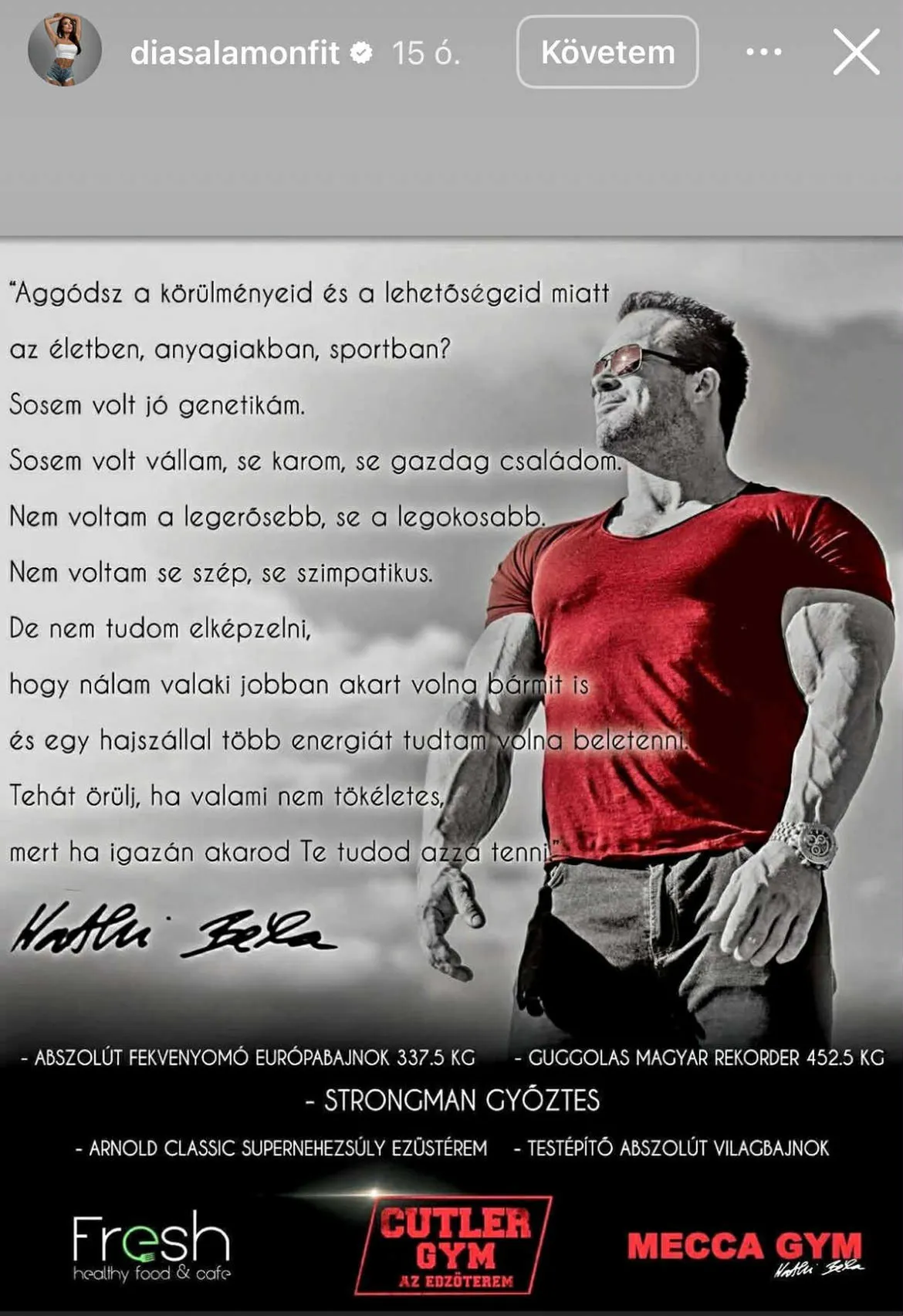 Kathi Béla egy ország példaképe volt, hihetetlen motiválókészsége nagyon sok embernek adott erőt. Felesége, aki megható családi fotókkal búcsúzott férjétől, Instagram-történetben megosztott egy olyan képet is, amely Kathi Béla mentalitását mutatja meg.