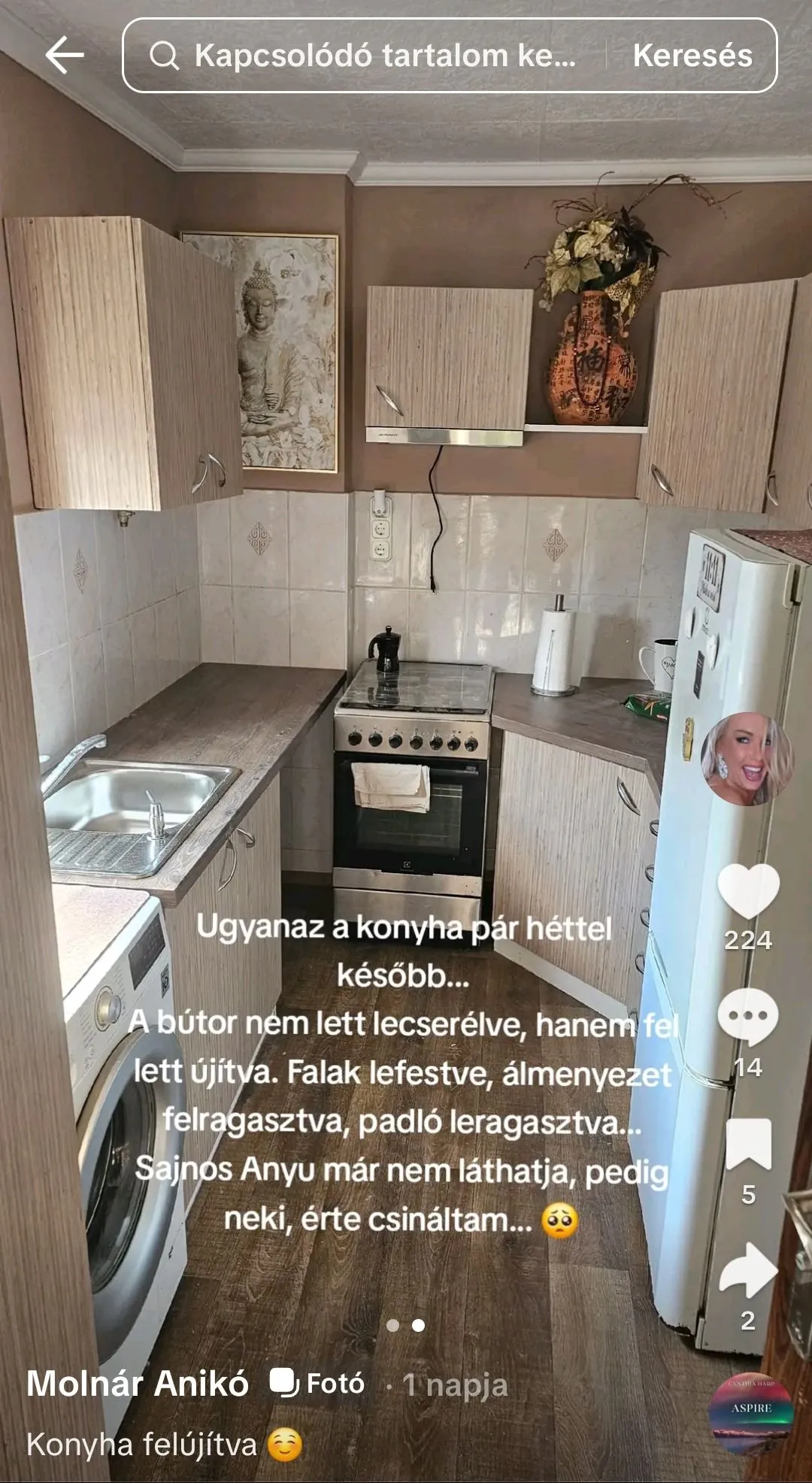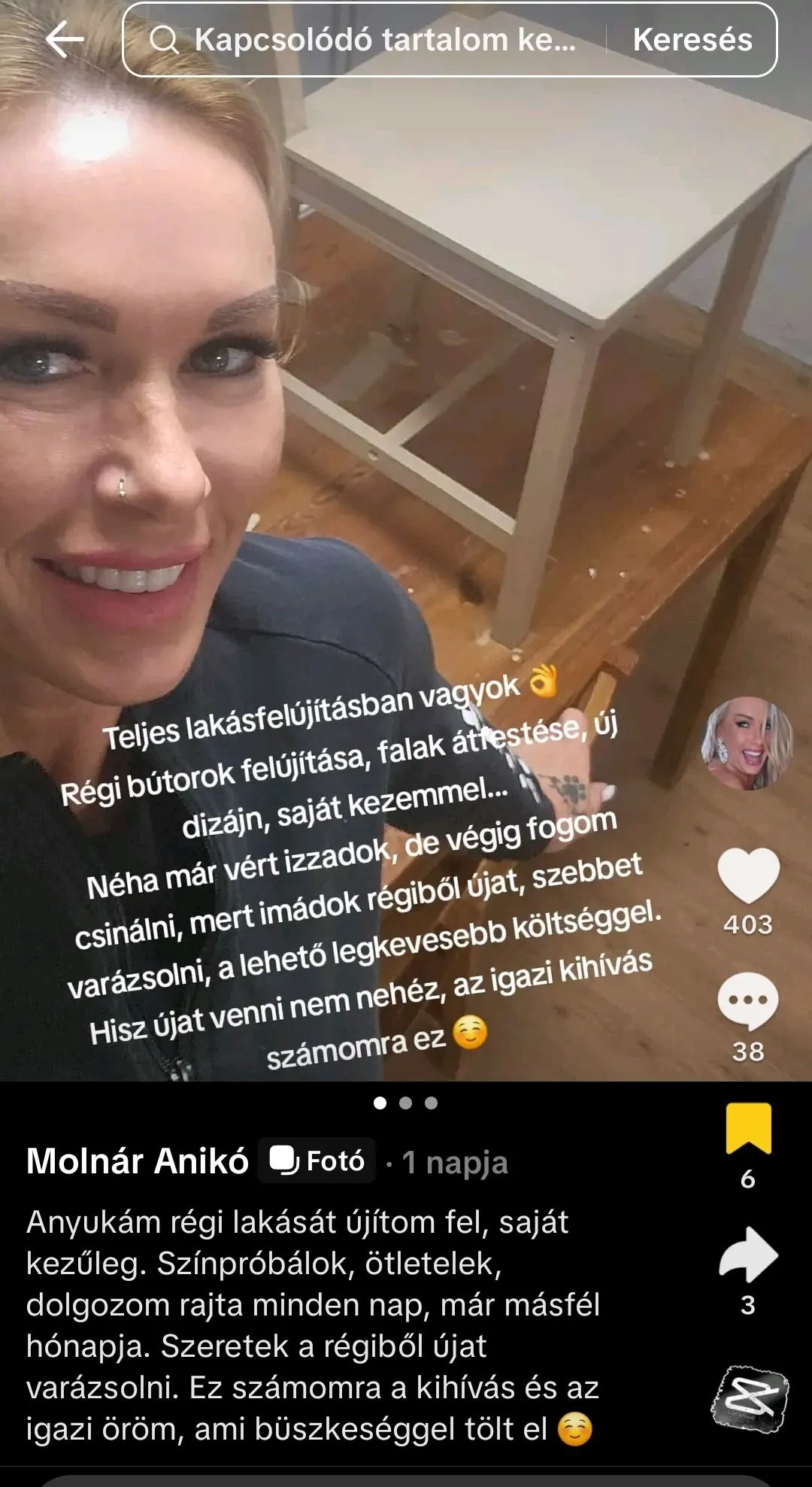 Anikótól sosem állt távol a kétkezi munka: fest, csiszol, álmennyezetet ragaszt, sőt, bútorokat restaurál. A régi, lakkozott fenyőbútorokat saját kezűleg keni le modern festékkel, mintha minden egyes ecsetvonással a saját lelkét is gyógyítaná. Még a konyhát is ő maga tervezte át, és büszkén meséli, hogy a pultok és az ajtók is hamarosan a helyükre kerülnek.