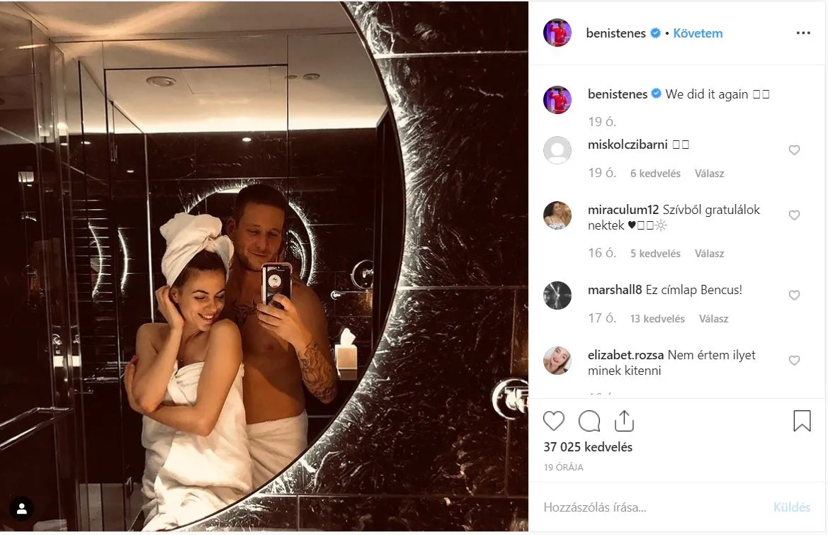 Árulkodó fotót osztott meg az Instagramon Istenes Bence! A műsorvezető kedvesével, Csobot Adéllal pózolt hiányos öltözetben egy fürdőszobában.