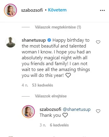 „Boldog születésnapot a leggyönyörűbb és legtehetségesebb nőnek, akit ismerek. Remélem, hogy varázslatos estéd volt a barátaiddal és a családoddal. Alig várom, hogy lássam azokat a fantasztikus dolgokat, amiket még az idén csinálsz majd” – írta Shane, aki valószínűleg azt a választ kapta, amire már nagyon várt: Zsófi ugyanazzal a hangulatjellel, egy hófehér szívecskével reagált a köszöntésre.
