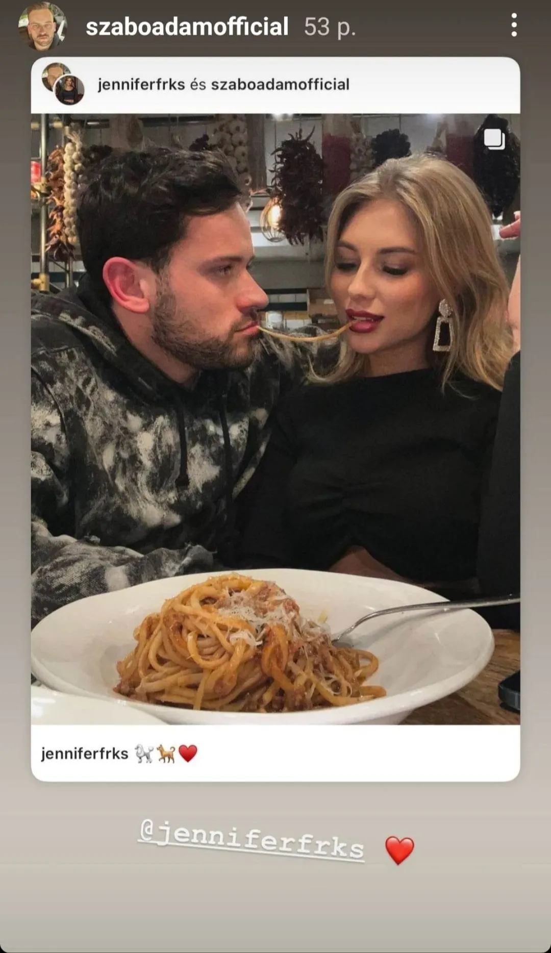 Azóta teltek-múltak a hetek, hónapok és a harmonikás-énekes szerelme erősebb, mint valaha. A minap ismét egy étteremben jártak, ahol felelevenítették a Susi és Tekergő szerelmes, spagettis jelenetét.
