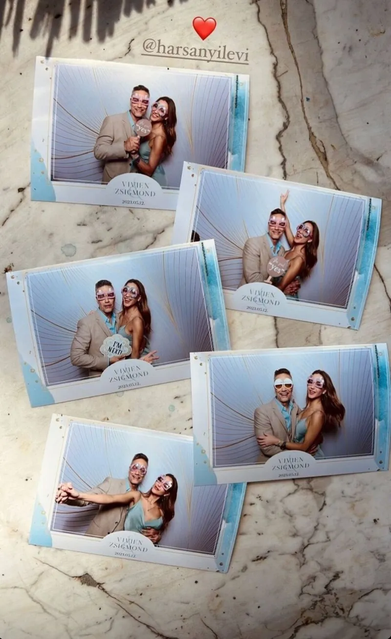 Harsányi Levente az Instagram-oldalán 24 órán át látható történetében osztott meg néhány közös fotót a kedvesével, Larával. A képeken a műsorvezető „I’m next” (Én leszek a következő) és „She said YES” (IGENT mondott a lány) feliratú táblákat tart a kezében, ami láttán azt hihetnénk, szintet lépett a kapcsolatuk és megtörténhetett az eljegyzés. A félreértések elkerülése végett a pillanatokat Vasvári Vivien esküvőjén örökítették meg, az ifjú pár ugyanis a vendégek számára fotózási lehetőséget biztosított, ezzel is színesítve a nagy napot.
