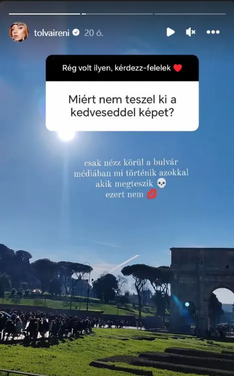 Tolvai Reni most éppen Rómában van, valószínűleg nem egyedül. A világ egyik leggyönyörűbb városa és kulturális központja olyannyira leköti az énekesnő érdeklődését és figyelmét, hogy közben az Instagramon válaszol a rajongók által feltett kérdésekre. Egy rajongója pedig élesen bekérdezett: tudni szerette volna, hogy miért nem mutatja meg párját a nyilvánosságnak. Reni az erre azt felelte, hogy fél, hogy a média szétcincálja. Ezzel tehát elismerte, hogy újra boldog párkapcsolatban él, magánéletét azonban védeni kívánja.