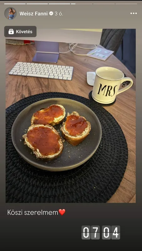 Péntek reggel szerelme különleges reggelivel lepte meg őt: lekváros kalácsot készített a kívánós kismamának. A képen jól látszik Fanni bögréje is, Mrs. felirattal, ami arra utalhat: Fanni idő közben feleség is lett!