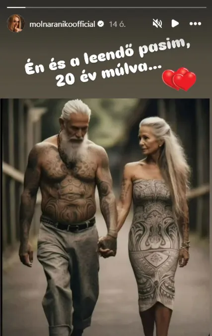 A szexi szőkeség az Instagramján osztott meg egy fényképet egy őszülő párról: egy tetovált, deres hajú nő sétál kézen fogva egy ugyan kissé pocakos, de jó fizikumú, vagány, ősz szakállú, copfos, tetovált férfival.