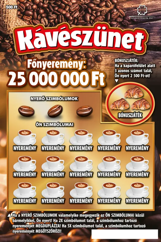 A Kávészünet sorsjegy kapcsán további információkért látogasson el a Szerencsejáték Zrt. weboldalára.