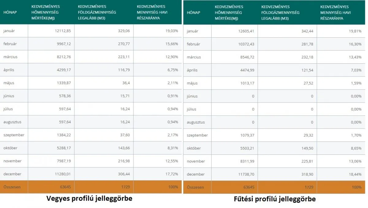 Az energiaszolgáltató gázfogyasztással kapcsolatos tájékoztatójában részletesen kitérnek erre a kérdésre. Ebben az olvasható, hogy nem átalánydíjas fizetési mód választása esetén a rezsicsökkentett áron számlázandó mennyiség meghatározása idő- és fogyasztásarányosan, a fogyasztási jelleggörbe alapján történik. A fogyasztási jelleggörbe azt jelenti, hogy a szolgáltató az ügyfelek átlagos fogyasztási adatai alapján nem havonta egyenletesen osztja el a kedvezményes, egy évre járó mennyiséget, hanem alkalmazkodik a felhasználás ritmusához, ami nyáron alacsonyabb, télen magasabb gázfelhasználást jelent. Így nyáron alacsonyabb, télen magasabb kedvezményes mennyiségű gázt írnak jóvá. Ez a gyakorlatban azt jelenti, hogy aki vegyes profilú felhasználónak minősül, vagyis aki a gázt vegyesen használja fűtésre, főzéshez és vízmelegítéshez, annál máshogy osztja el a szolgáltató a kedvezményes gáz mennyiségét, mint aki csak fűtésre.
