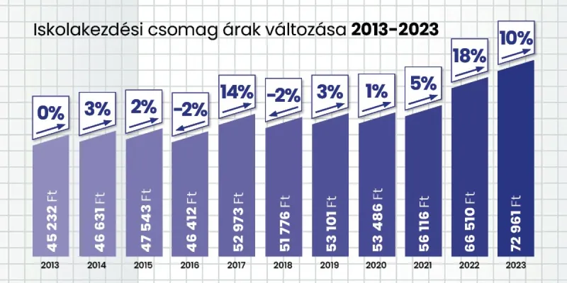 Az iskolakezdéshez szükséges csomagok ára az elmúlt 10 évben 60%-kal nőtt, 2021-ről 2022-re 18%, míg tavaly óta újabb 10%-os árnövekedést tapasztalhattak meg a családok.