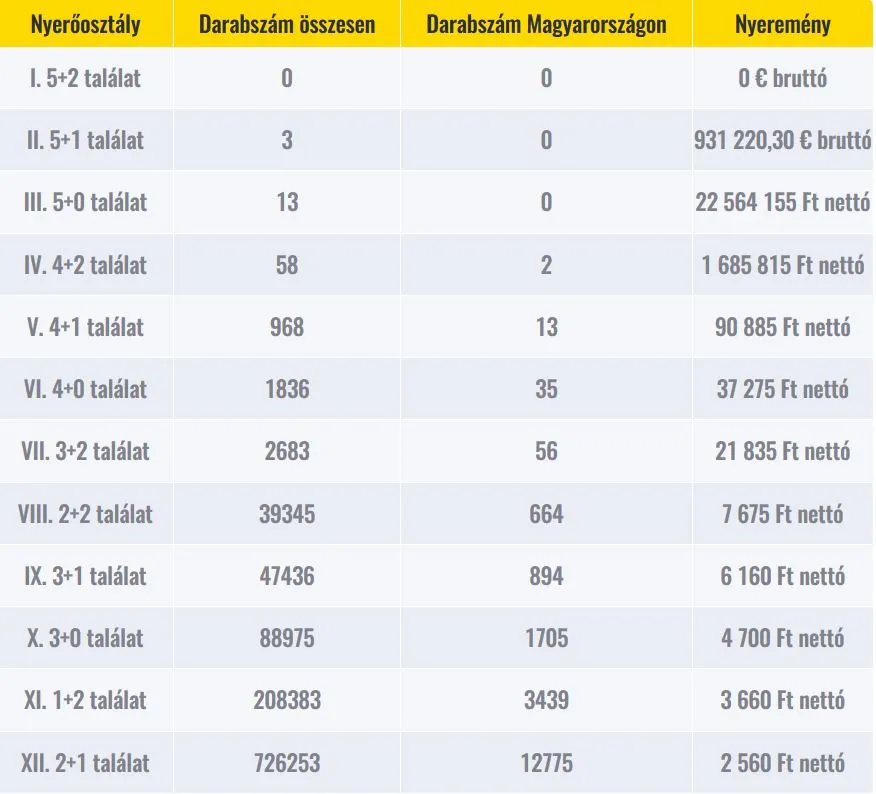 Az EuroJackpot játékban az „A” mezőn 50 számból ötöt, a „B” mezőn pedig 10 számból kettőt kell megjelölni. A hetente megrendezett sorsoláson az nyer, akinek az „A” és „B” mezőben elért találatainak száma legalább 3.
