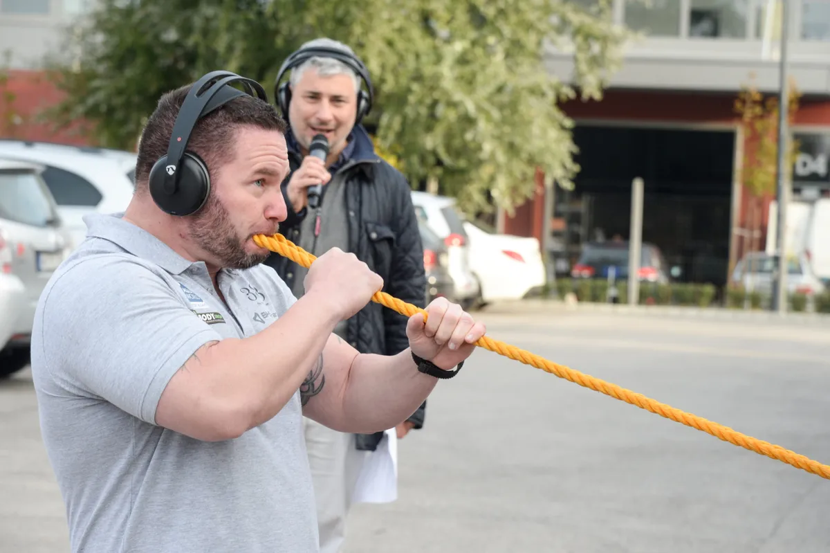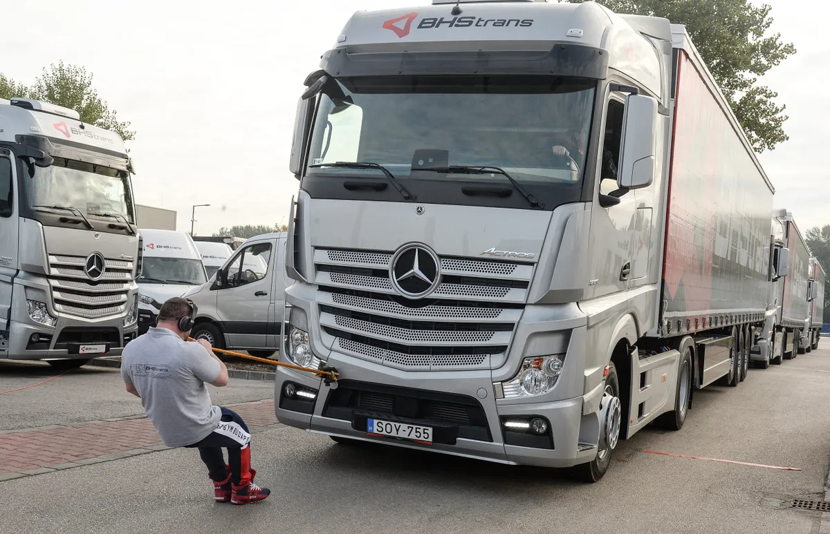 Még a cipőtalpa is elkopott Sinka Zsolt erőembernek, mire 17,3 méterre elhúzta fogával az egymásba fűzött három kamiont, melynek összsúlya 100 tonna volt. Állkapocs- és nyirokmasszőre a partvonal mellett izgulta végig az emberfeletti mutatványt.