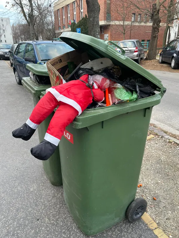 Bizony a képen jól látszik, hogy valaki kidobta a kukába a Mikulást. A tehetetlen plüssfigura így meglehetősen érdekes pozícióban hevert a szemetesben, amit egy leleményes járókelő meg is örökített.