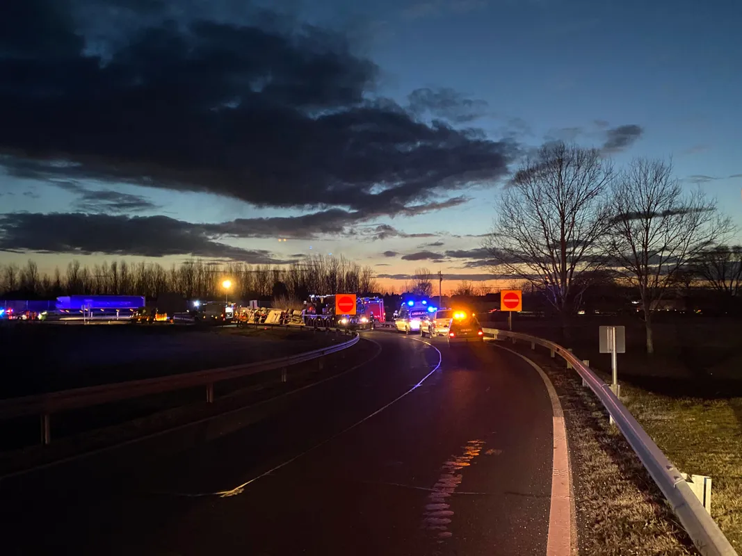 A szalagkorlátot átszakítva az oldalára borult egy kamion az M5-ös autópálya Budapest felé vezető oldalán, az újhartyáni lehajtón. Egy ember beszorult a fülkébe. A dabasi és a ceglédi hivatásos tűzoltók feszítővágóval és csörlővel dolgoznak a kiszabadításán. A helyszínre érkezett a Pest megyei katasztrófavédelmi műveleti szolgálat, és oda tart egy tűzoltódaru Budapestről is – írja a katasztrófavédelem.