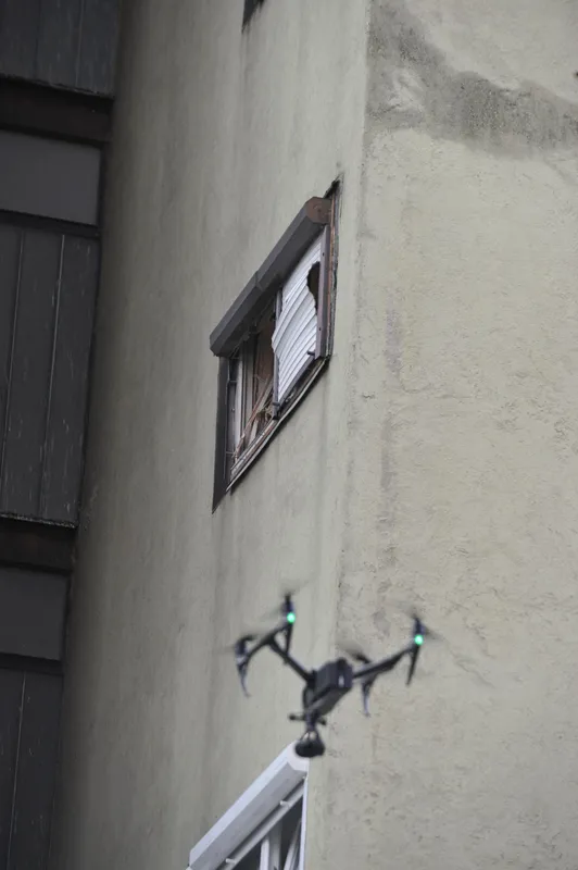 A rendõrség szakemberei drónnal vizsgálják 2020. március 8-án azt a tízemeletes társasházat Vácott, amely elõzõ este egy detonáció következtében megsérült. A Vám utcai épület lakható maradt, de száznyolc ember kénytelen volt ideiglenesen elhagyni. A statikus szakértõ véleménye alapján a lakók azóta visszatérhettek otthonukba. Jelenleg semmiféle adat nem támasztja alá a szándékosságot, a rendõrök továbbra is keresik a robbanás okát.