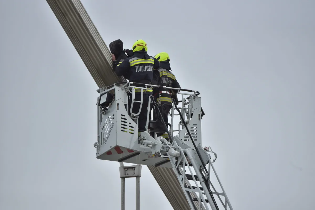 A helyszínre érkeztek a fővárosi tűzoltók is, akik a rohamkocsi kosaras létrájával közelítették meg, majd hozták le a magasból a férfit.