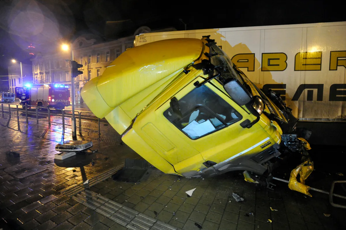 Összeroncsolódott kamion a fõváros XIII. kerületében, a Róbert Károly körút Árpád híd felé vezetõ oldalán 2020. december 23-án. A teherjármû összeütközött egy busszal, majd a villamossínekre hajtott. Egy ember megsérült.