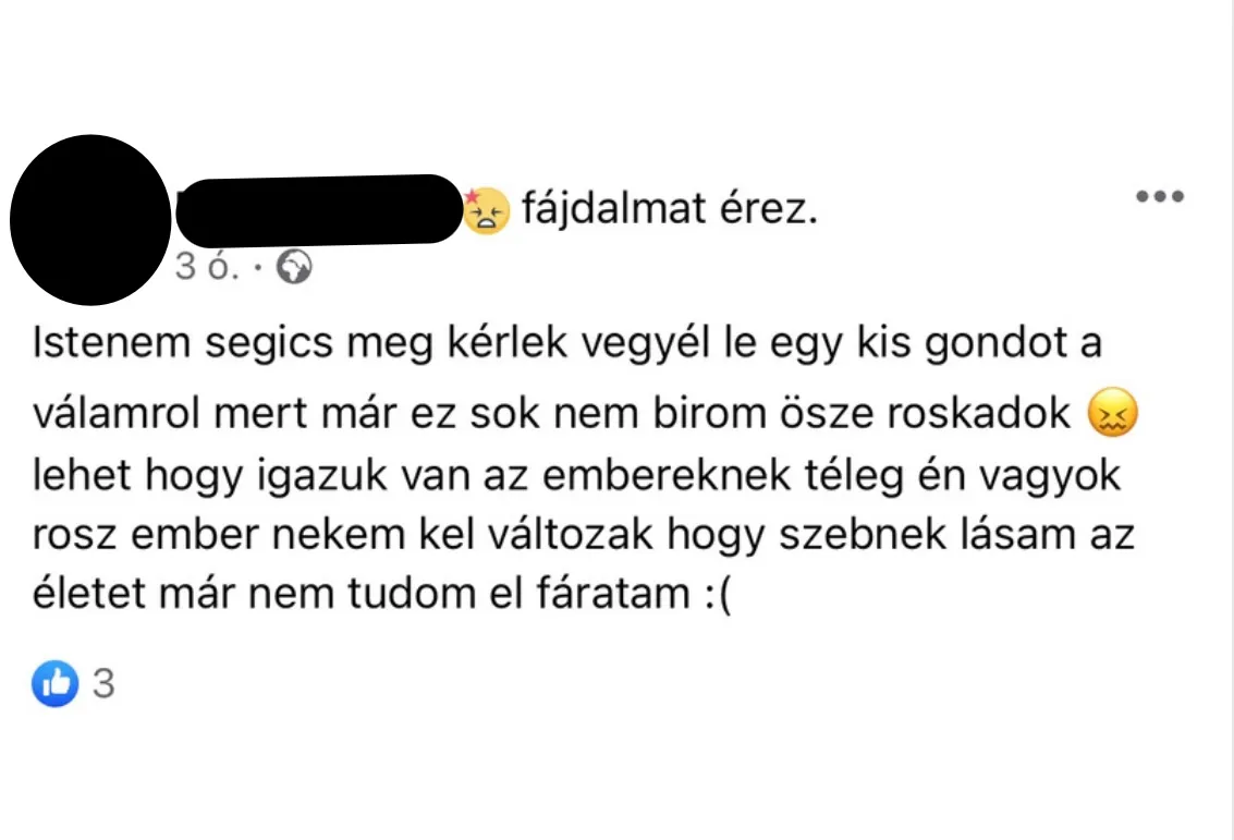 „Istenem, segíts meg kérlek. Vegyél le egy kis gondot a vállamról, mert ez már sok, nem bírom, összeroskadok. Lehet, hogy igazuk van az embereknek, tényleg én vagyok rossz ember, nekem kell változnom, hogy szebbnek lássam az életet. Már nem tudom, elfáradtam” – olvasható a bejegyzésében.