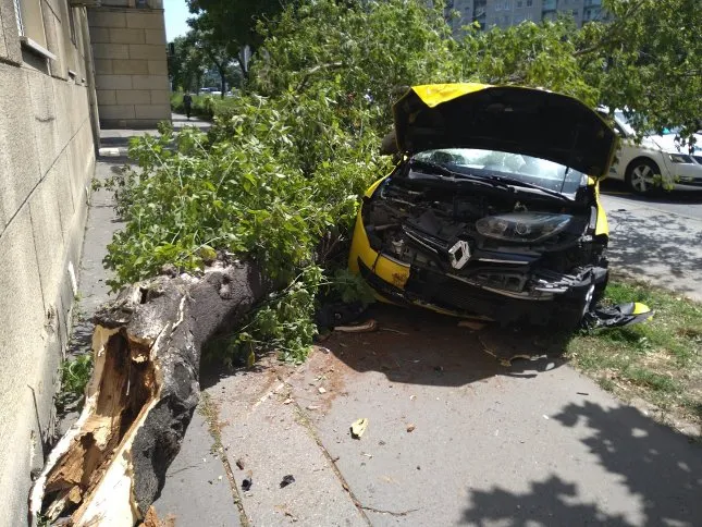 A nagy erejű ütközés a taxit kilökte a járdára, ahol a sárga jármű egy fát is kidöntött. A taxi totálkárosra tört.