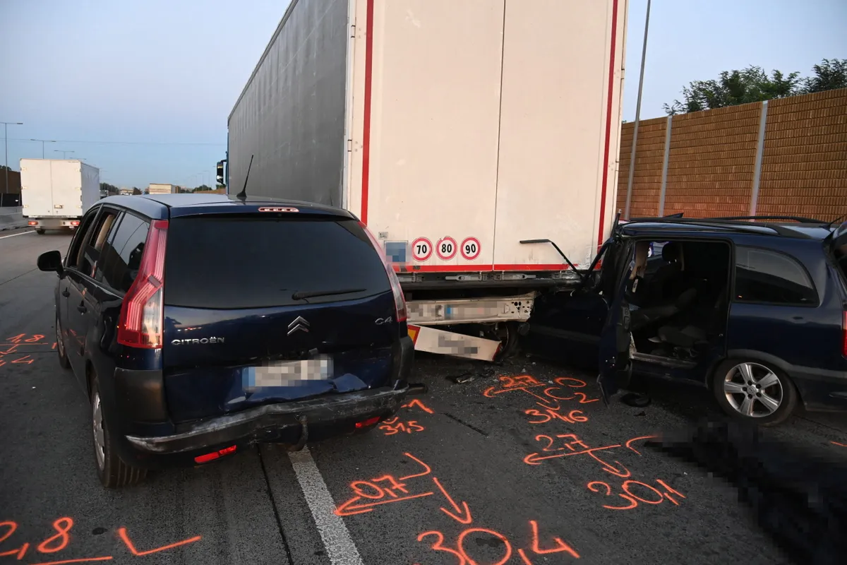 Összeütközött egy kamion és két személyautó Budapest XXII. kerületében, az M0-ás autóúton, az M5-ös autópálya felé vezető oldalon, a 12. kilométernél.