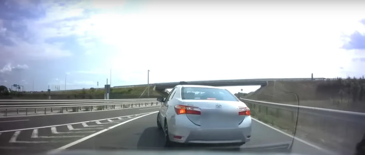 Egy Toyota sofőrje egyik pillanatról a másikra gondolt egyet és konkrétan a forgalommal szembe fordult. A mögötte haladó autós fedélzeti kamerája rögzítette az esetét, miközben a sofőrje dudával próbálta figyelmeztetni a tévedésre.