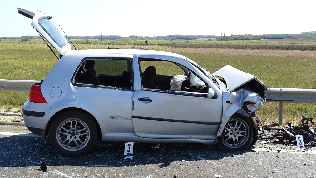 Összeroncsolódott személyautó a 44-es fõúton Tiszakürt külterületén 2021. szeptember 11-én, miután a jármû frontálisan összeütközött egy másik autóval. A balesetben ketten meghaltak.