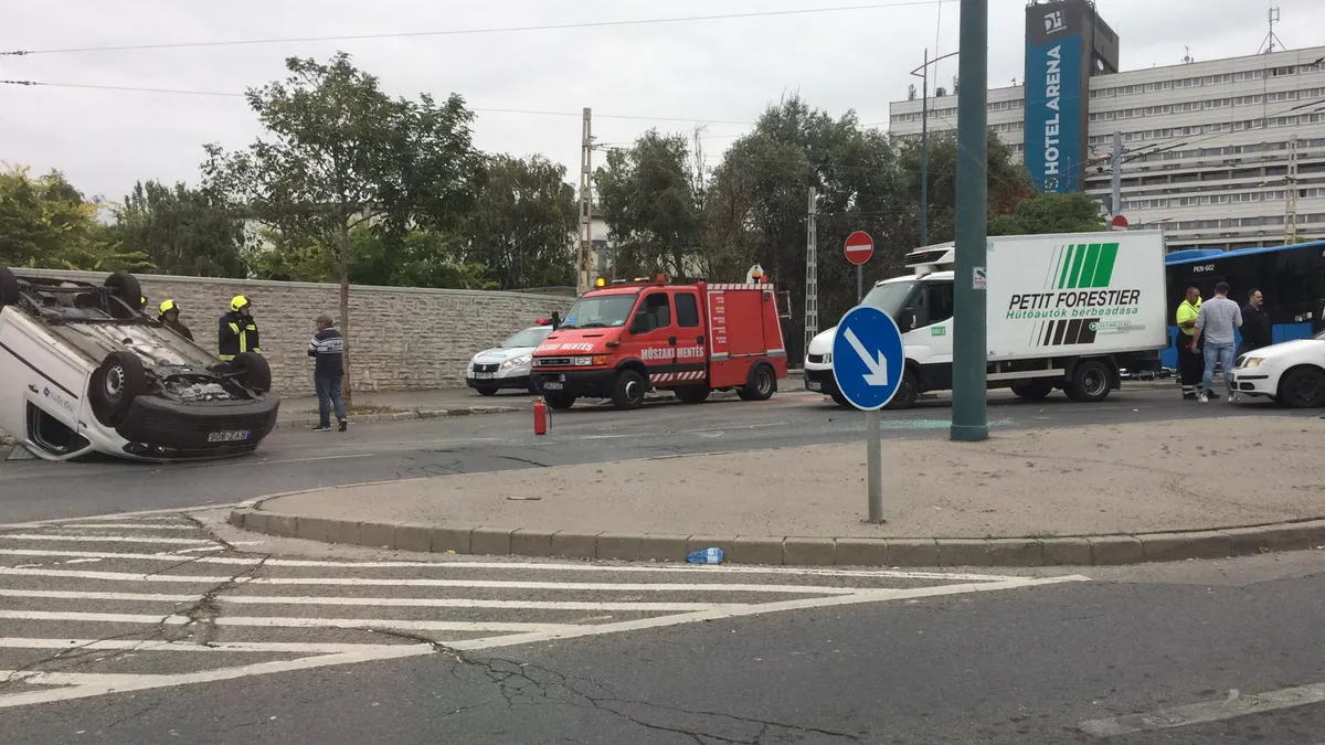 A tetejére borult egy kisteherautó a Stadionoknál, a Dózsa György út és a Kerepesi út csomópontjánál.