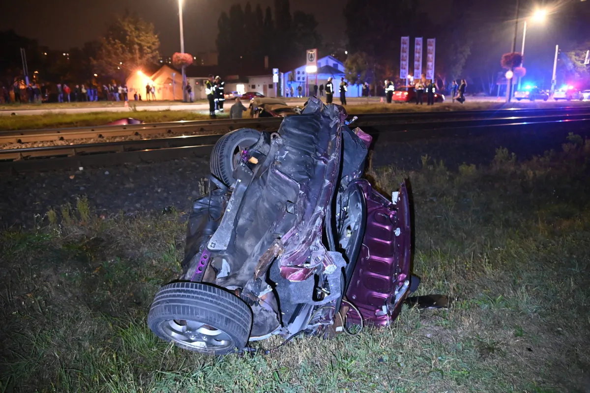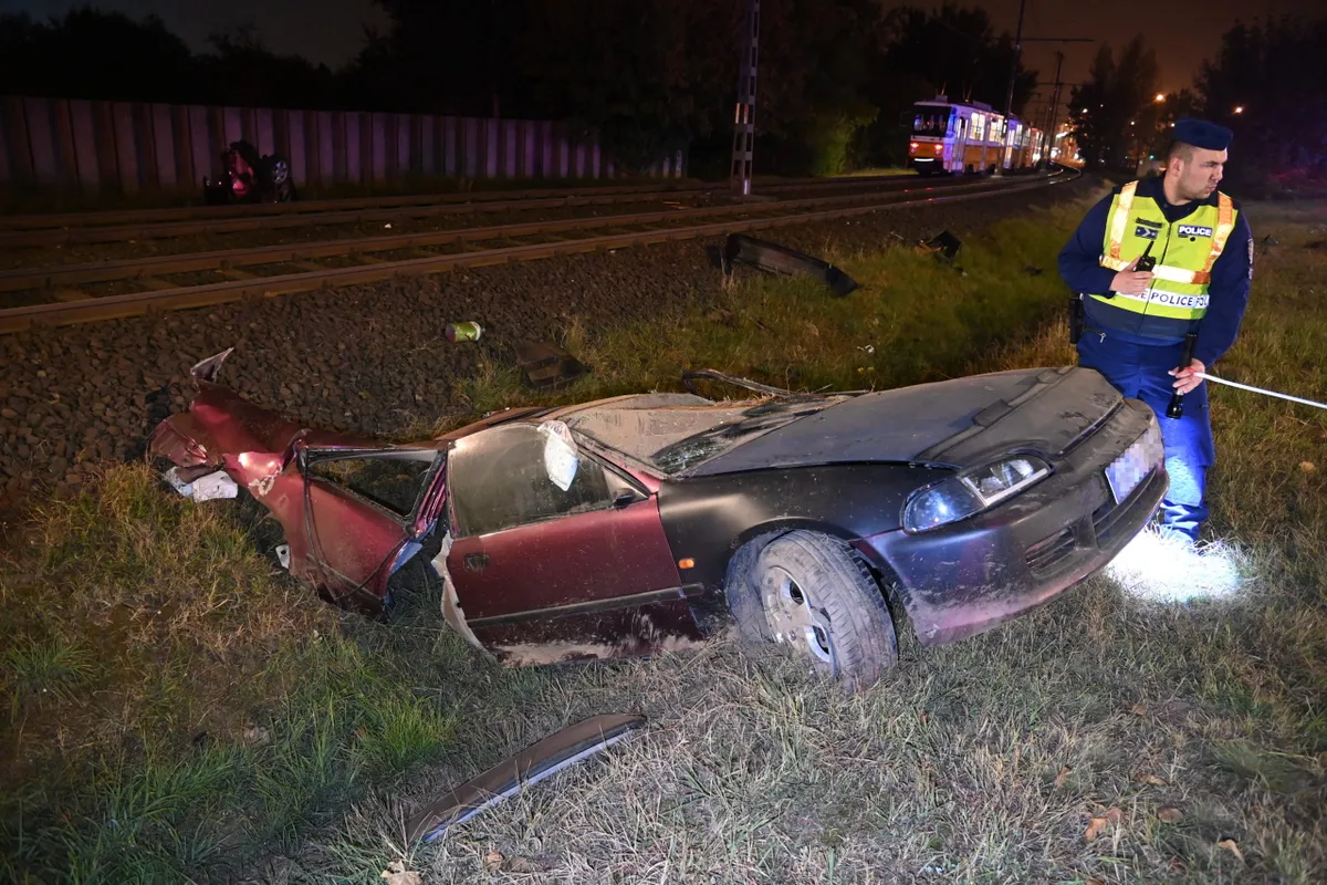 Villanyoszlopnak ütközött, majd kettészakadt személygépkocsi roncsa a Külső Szilágyi úton 2021. szeptember 29-én. A balesetben a sofőr életveszélyes, utasa csak könnyebb sérülést szenvedett. A roncsok a villamossínek két oldalára sodródtak.