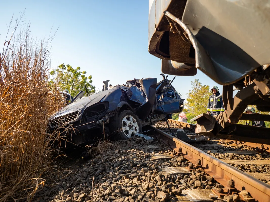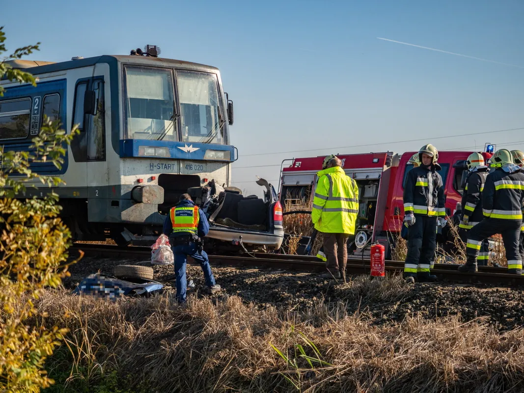 Ütközésben összeroncsolódot személygépkocsi a Mélykút és Bácsalmás közötti vasútvonalon 2021. október 28-án. A vonattal ütközõ autóban négy nõ utazott, egyikük a helyszínen életét vesztette, egyet pedig mentõhelikopterrel vittek kórházba.