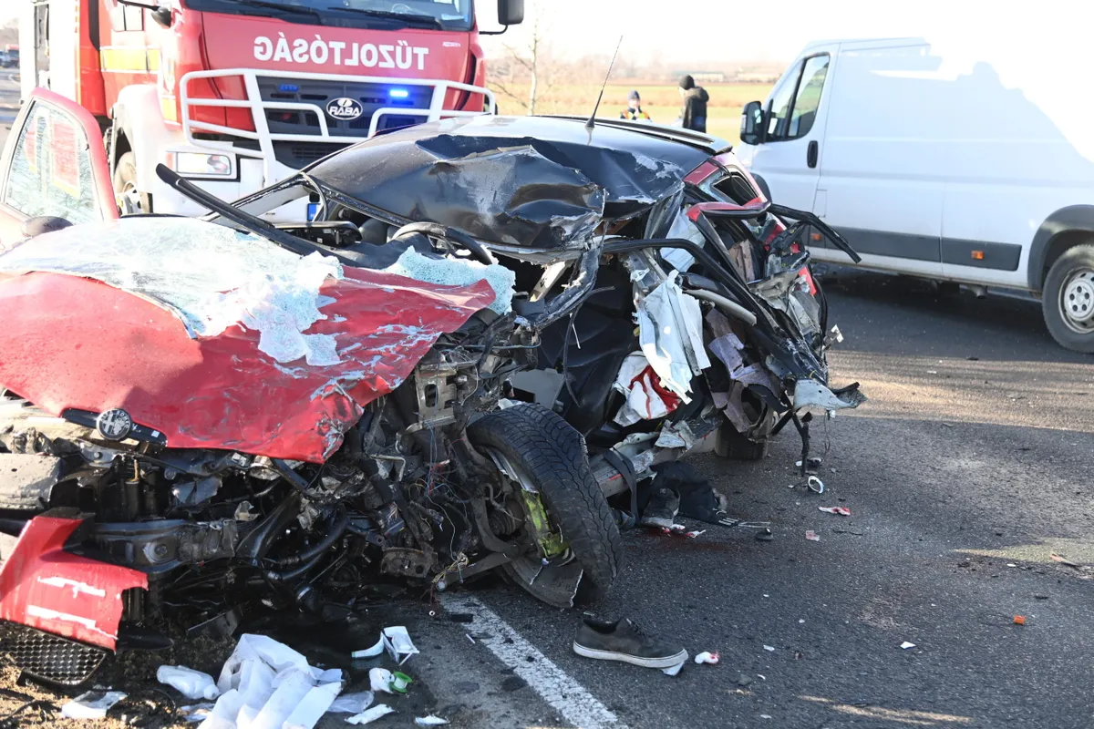 Összeroncsolódott személyautó, miután összeütközött egy kisteherautóval az 51-es úton Taksony térségében 2022. január 14-én. A balesetben hárman megsérültek.