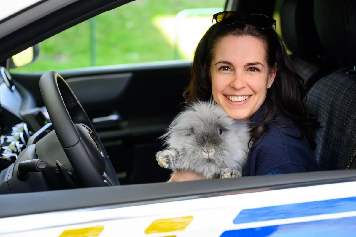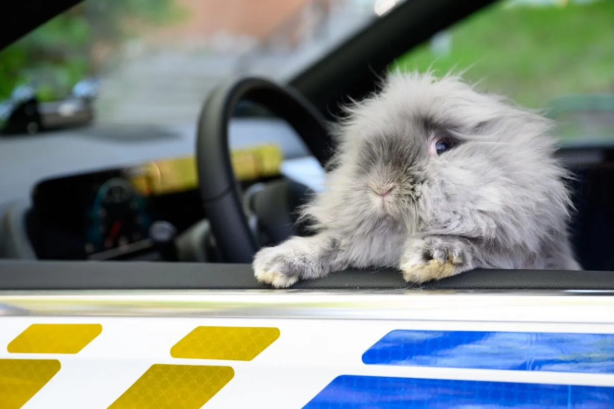Géza nemcsak cuki, de szerencsés is. Na nem azért, mert rendőrautóba került, hanem azért, mert életben maradt. Géza ugyanis egy mentett nyuszi. Nem ismerjük az előéletét, sem a gazdáját, aki magára hagyta, amikor megbetegedett. Csak annyit tudunk, hogy állatmentők vették magukhoz, meggyógyították, majd egy rendőrnő meglátta, megszerette és örökbe fogadta. Azóta ő is a testülethez tartozik, és egy fotózás erejéig most még a járőrkocsit is kipróbálhatta.