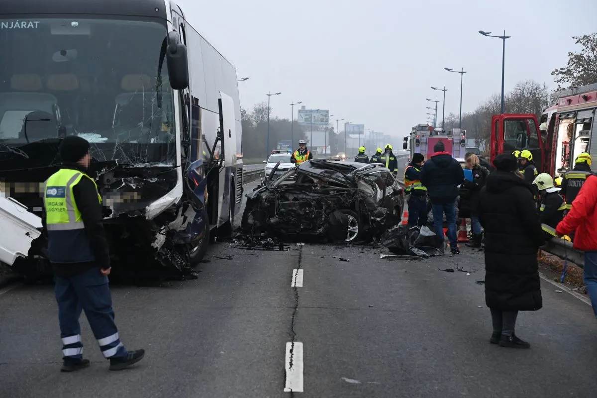 Két férfi meghalt, amikor egy autó és egy busz összeütközött vasárnap reggel a Ferihegyi repülőtérre vezető úton – közölte a Budapesti Rendőr-főkapitányság a police.hu oldalon. A tragédia helyszínén készült fotókon jól látszik, hogy az autó eleje a felismerhetetlenségig összeroncsolódott az ütközés során.