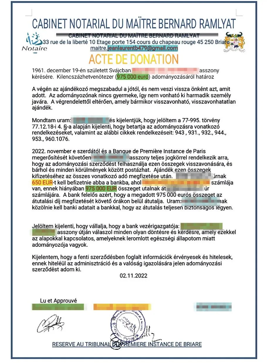 A csaló végül az általa elkért és megkapott adatokkal elkészítette és el is küldte a „szerződést” az újságírónak, amiből kiderült, hogy a 975 ezer euró folyósításának feltétele, hogy előre átutaljon 650 eurót, azaz 260 ezer forintot. A Facebook-profil kezelője még képeket is küldött „magáról”, ám azokról a Google-kereső segítségével percek alatt kiderült, hogy a 2017-ben elhunyt francia színésznőt, Emmanuelle Rivát ábrázolják.