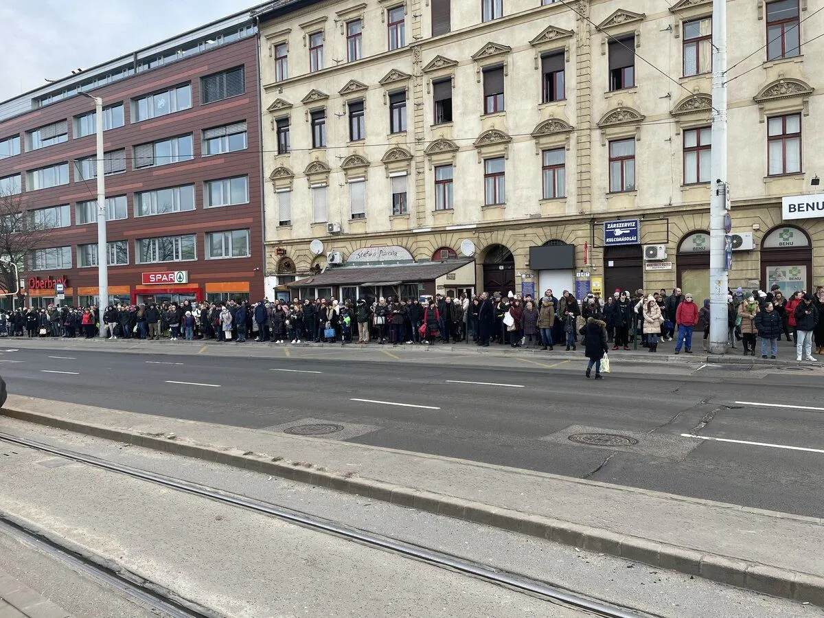 Tömegek várakoznak a pótlóbuszra a Puskás Ferenc Stadion megállónál.