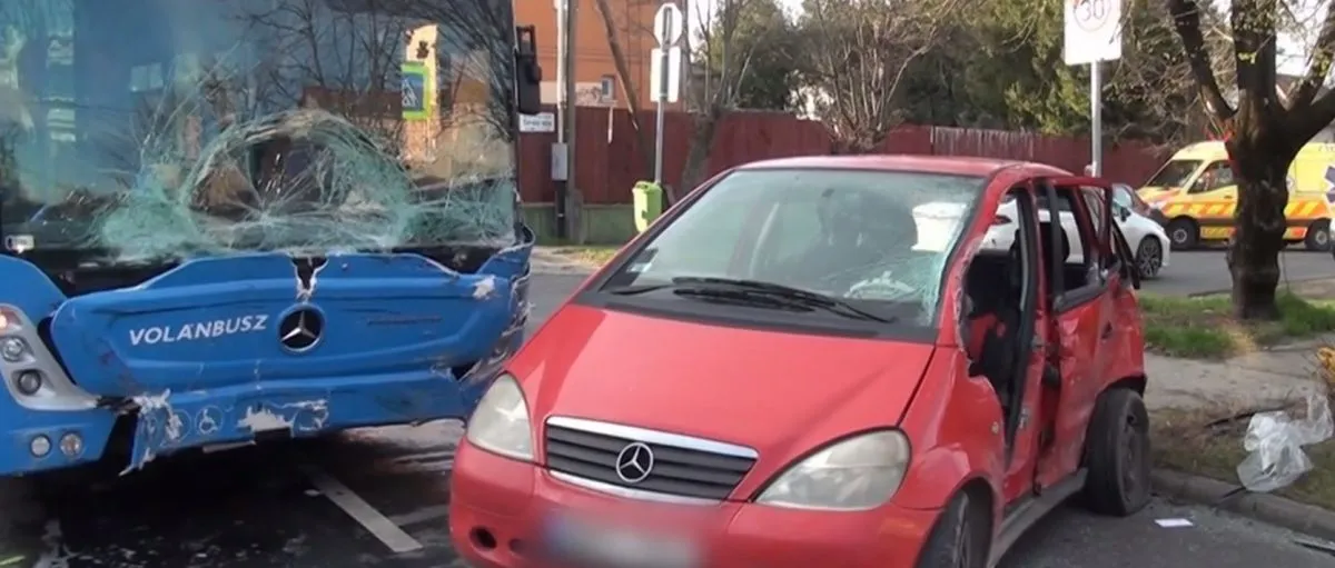 A buszon sokan utaztak, a baleset ugyanis a reggeli csúcsforgalomban történt: összesen nyolc ember sérült meg, ketten súlyosan. Úgy tudni, a piros kocsi sofőrje nem adott elsőbbséget, ezért karamboloztak. A busz szélvédője pókhálósra tört, az eleje pedig összeroncsolódott, a vétkes Mercedes pedig totálkáros lett a karambolt követően: az ajtaját a tűzoltók vágták le, méterekre hevert a roncstól a földön.